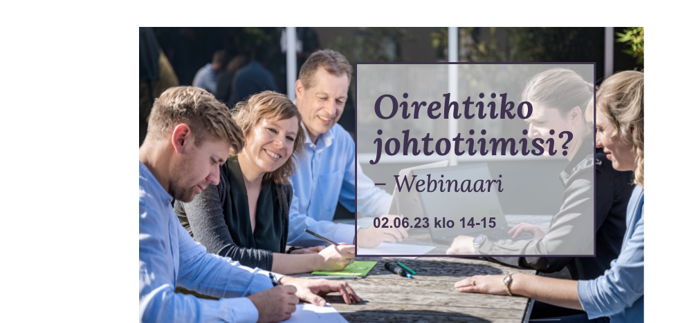 Pidimme Oirehtiiko johtotiimisi? -webinaarin 2.6.2023 klo 14-15. Voit tilata webinaarin tallenteen sivun alaosasta löytyvällä lomakkeella ja saada oivalluksia sinulle sopivaan aikaan!